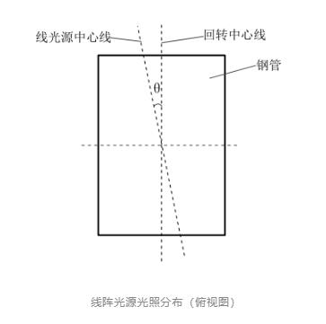 面陣光源光照分布(正視圖)另一情況如圖所示,采用線陣相機(jī)和線陣光源實(shí)現(xiàn)鋼管表面缺陷動態(tài)檢測時,因振動、裝配誤差等因素,線陣光源中心線與線陣相機(jī)視野長度方向并非位于同一直線,相機(jī)視野方向通常與鋼管回轉(zhuǎn)中心所在直線一致;這種情況會降低照射區(qū)域與視野區(qū)域重合性,導(dǎo)致成像結(jié)果光照不均現(xiàn)象嚴(yán)重,進(jìn)一步增加圖像處理的困難度。
