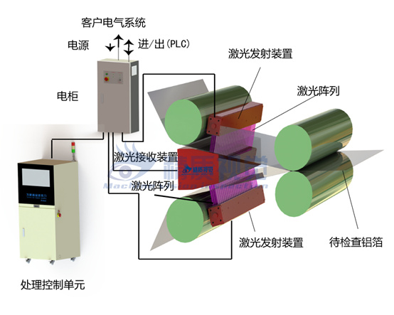 通過高精度激光器發(fā)射激光,經(jīng)過微透鏡陣列后,形成具有高準(zhǔn)直度的平行光束,將其全面覆蓋在鋁箔表面,實現(xiàn)對鋁箔的全面檢測。smP機器視覺檢測設(shè)備_CCD視覺檢測_外觀缺陷檢測系統(tǒng)_精質(zhì)視覺