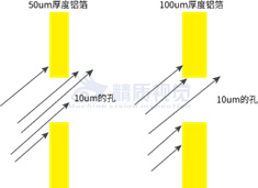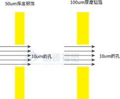 激光光源的發(fā)散角很小,幾乎是沿著平行方向發(fā)射的。不同厚度的鋁箔,同樣大小的針孔,檢測(cè)出來的孔洞面積是一致的。