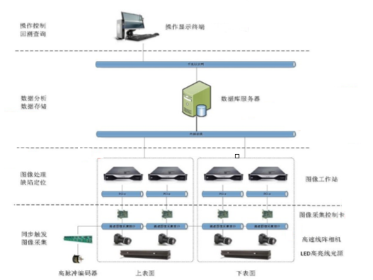 計算機系統(tǒng)通過數(shù)據(jù)庫來記錄和管理瑕疵的橫縱向位置、數(shù)量、大小和圖像等信息,同時可通過信號控制系統(tǒng)實現(xiàn)聲光報警等操作。