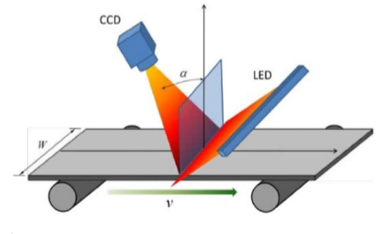 成像模塊為三大核心子模塊之一,通過工業(yè)線掃相機搭配工業(yè)線掃鏡頭以及LED光源的高強度照射,實時采集材料表面圖像,并將采集到的圖片實時傳輸至圖像服務器供處理。成像模塊由高速 CCD相機(搭配線掃相機專用鏡頭) 、高性能光源(LED)等主要部件組成。